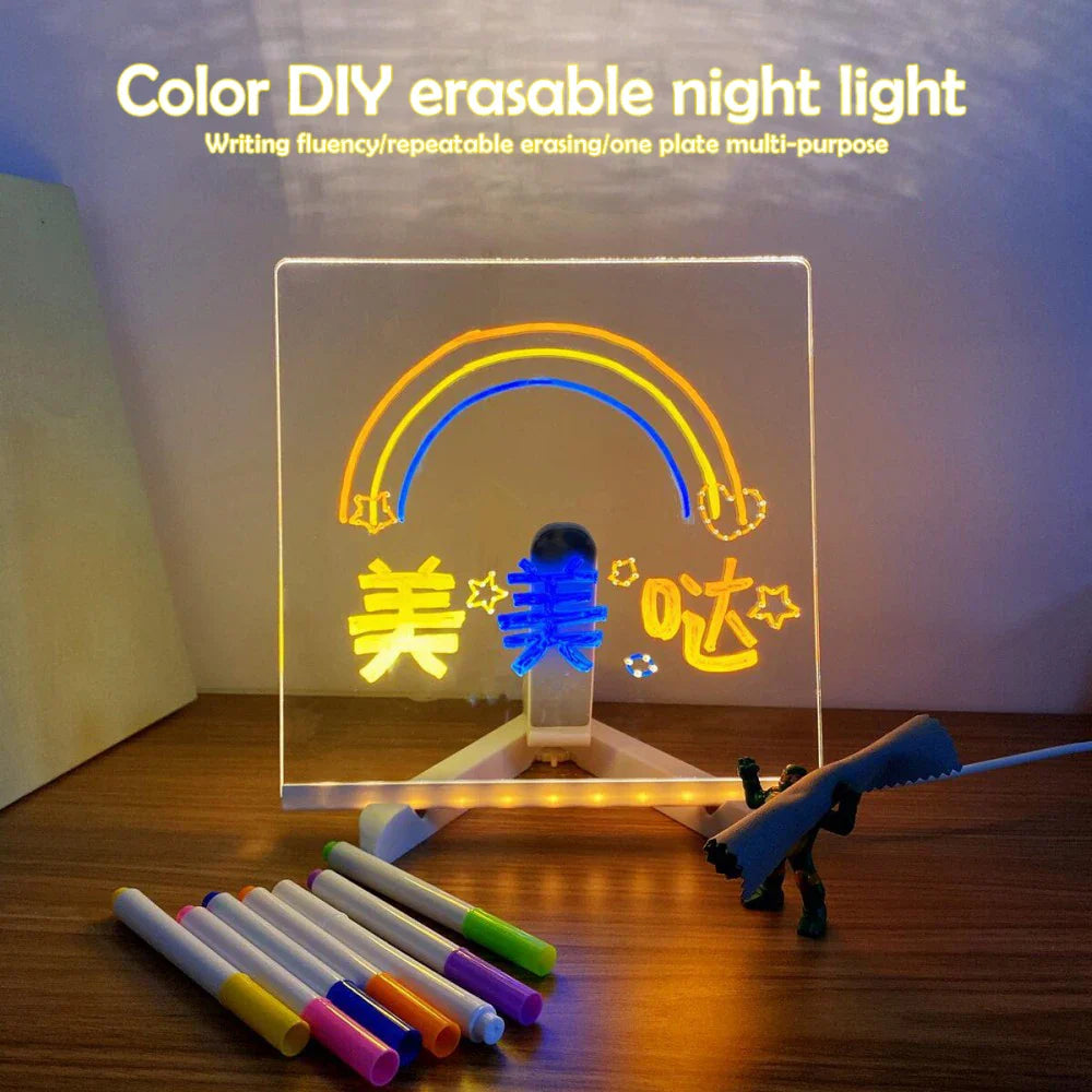 Transform your notes, reminders, and doodles into glowing works of art with the LED Message Board – DIY Acrylic Writing Pad with 7 Pens. This modern, eye-catching board allows you to express yourself in vibrant colour using the included fluorescent pens — perfect for daily inspiration, family messages, café menus, or holiday décor.